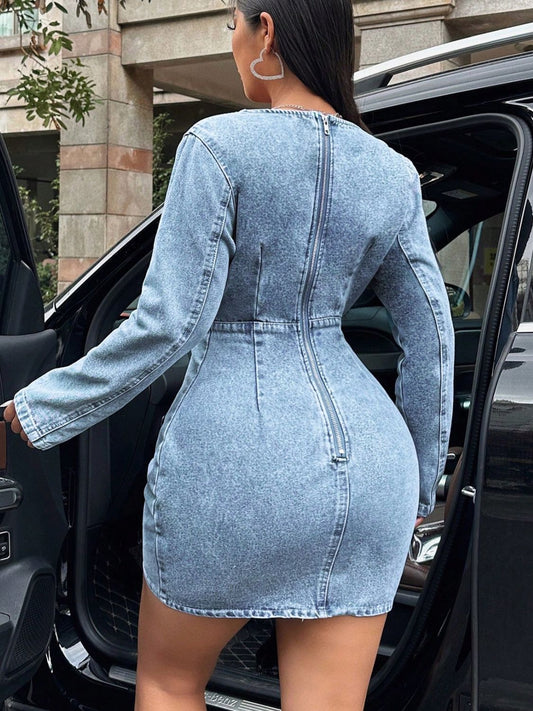 Tied Plunge Three-Quarter Sleeve Denim Dress